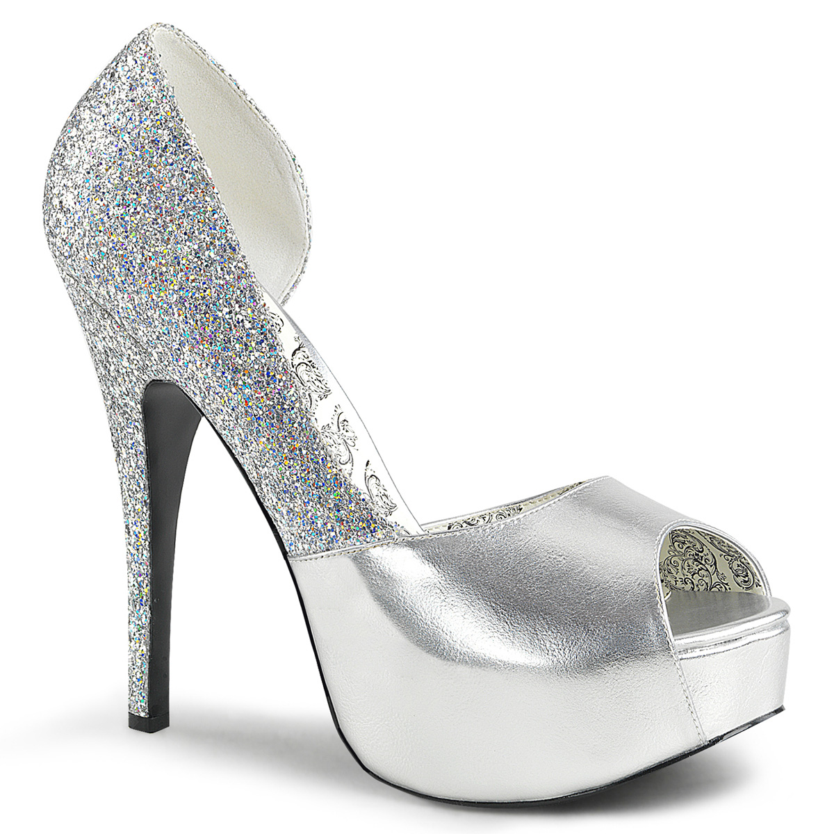 Srebrne czółenka z odkrytymi palcami na platformie z wysokimi obcasami